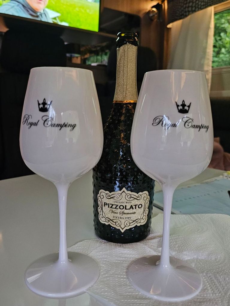 Vi körde en stund till innan vi slog läger på en p-plats för övernattning. En toast skagen, bubbel och Reiselinda på youtube fick avsluta den här fantastiska dagen 🙏🇧🇻❤️🍽🥂